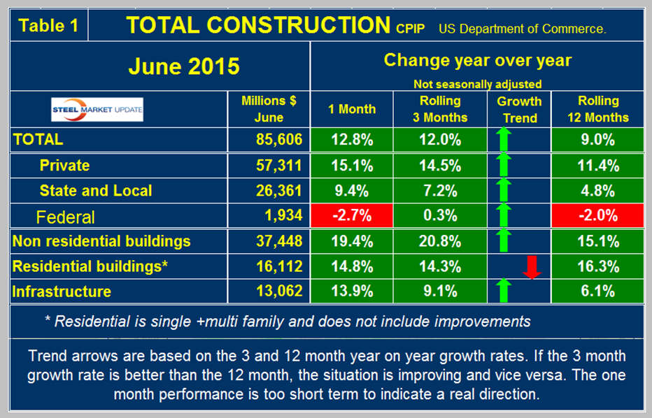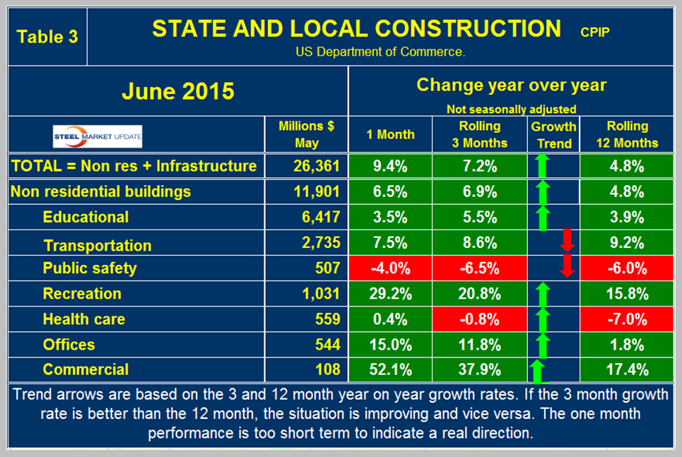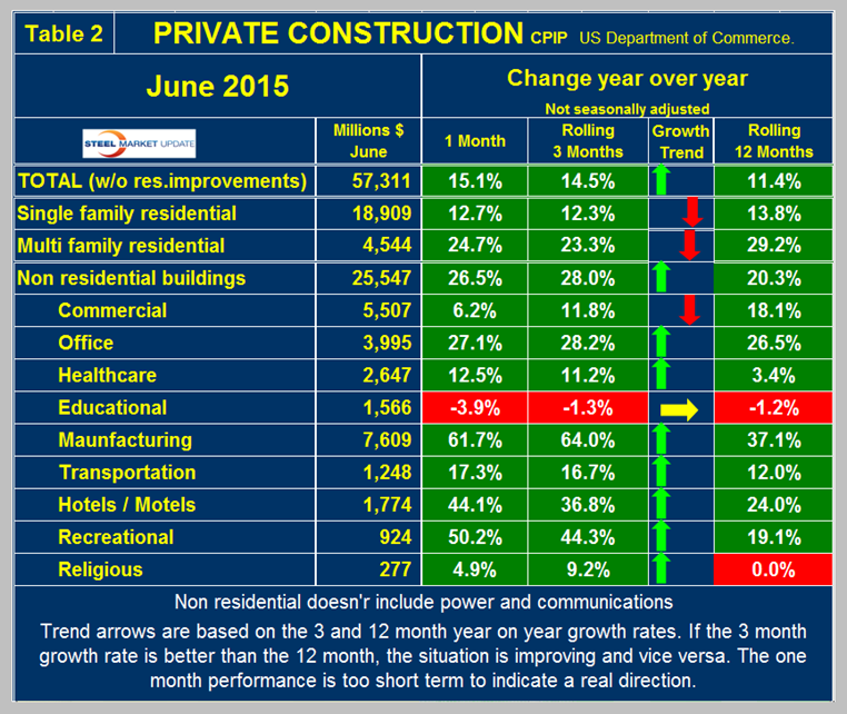 The blue lines in all four graphs in this report are 12 month totals which smooths out seasonal variation. Our analysis of residential construction in this report excludes improvements which are a huge expenditure but which we rationalize as a minimal consumer of steel. Excluding improvements our report shows that both single and multi-family residential continue to have strong y/y growth but both have negative momentum. The single family expenditures reported here have a rate of growth very similar to that of single family starts reported by the Census Bureau which have starts growing at 12.7 percent. Starts being similar to current expenditures we are discussing here suggests growth stability going forward. The growth of multifamily expenditures in this CPIP report is also almost exactly the same as construction starts of this sector reported by the Census Bureau. In this CPIP report multi family is growing at 23.3 percent as the multifamily housing starts data from the Census Bureau is growing at 23.5 percent. Note: the housing data published around the 12th of each month reports starts in which the total project cost is entered in the single month of groundbreaking. Private non-residential building expenditures grew at a 28.0 percent rate in three months through June y/y with a positive momentum. Within private non-residential, only education buildings had negative y/y growth on a rolling three months basis. About 70 percent of educational buildings are financed by state and local government and the educational sector as a whole grew at 4.0 percent. All segments of private commercial buildings except religious had double digit growth in this latest data. Religious buildings had positive growth in April, May and June for the first time since December 2009.