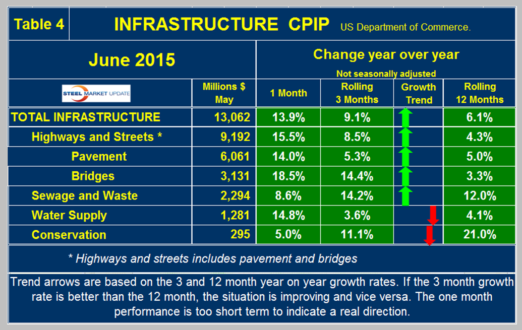 Infrastructure: Expenditures have had positive growth in each of the last 23 months through June with a +9.1 percent result in the latest data and with positive momentum. This was the best growth rate for infrastructure since December 2007. Highway and streets including pavement and bridges accounts for about 2/3 of total infrastructure expenditures and had positive growth for 15 months through February, contracted in March and April then grew by 2.7 percent and 8.5 percent in May and June respectively (Table 4).