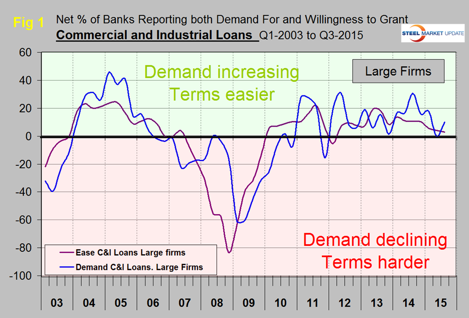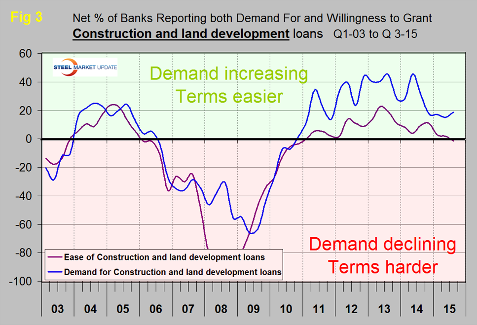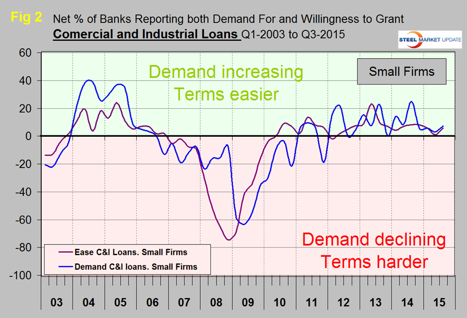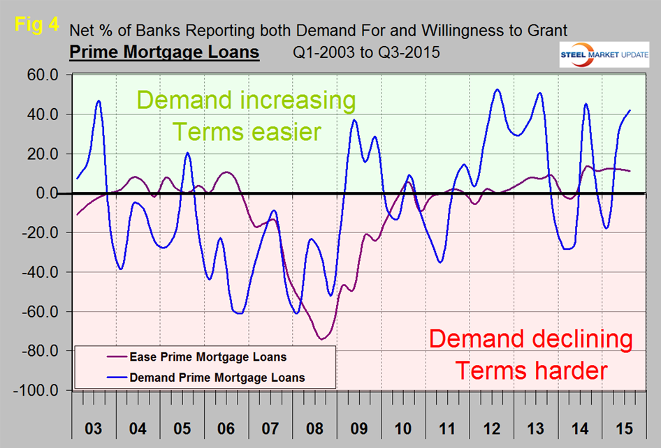 The implications of this report are reasonably good for steel people. Loan demand is positive for all categories. There has been a trend for less banks to be easing lending standards for C&I loans to large firms and for construction and land development loans in general. A net 2.9 percent of banks reported easing of standards for home equity lines of credit, with 21.7 percent reporting an increase in demand. A net 10.4 percent of banks are more willing to make consumer installment loans and a net 7.7 percent of banks have relaxed standards for credit card balances in the last three months. Demand for auto loans has improved strongly in the last three months with a net 17.8 percent of banks reporting an increase and there has been a small loosening of lending standards for auto loans.