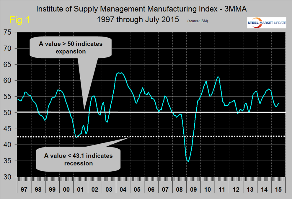 The Institute of Supply Management released their July report on August 3rd. An explanation of the ISM index is given at the end of this piece. After seven straight months of decline the index gained 1.3 points in May a further 0.7 points in June then declined by 0.8 points in July to 52.7 with a three month moving average of 53.0. The 3MMA declined for seven straight months between October and May then increased in June and July. Any number >50 indicates expansion. The three month moving average at 53.0 is above the 304 month average since March 1990 which stands at 52.21. There has only been one month in over five years that the index has not exceeded the positive growth threshold of 50, (Figure 1).