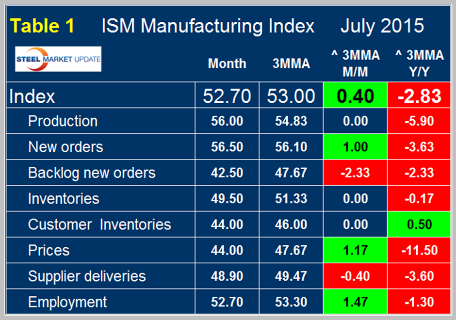 The report was issued today by Bradley J. Holcomb, CPSM, CPSD, chair of the Institute for Supply Management (ISM) Manufacturing Business Survey Committee. “The July PMI registered 52.7 percent, a decrease of 0.8 percentage point below the June reading of 53.5 percent. The New Orders Index registered 56.5 percent, an increase of 0.5 percentage point from the reading of 56 percent in June. The Production Index registered 56 percent, 2 percentage points above the June reading of 54 percent. The Employment Index registered 52.7 percent, 2.8 percentage points below the June reading of 55.5 percent, reflecting growing employment levels from June but at a slower rate. Inventories of raw materials registered 49.5 percent, a decrease of 3.5 percentage points from the June reading of 53 percent. The Prices Index registered 44 percent, down 5.5 percentage points from the June reading of 49.5 percent, indicating lower raw materials prices for the ninth consecutive month. Comments from the panel reflect a combination of optimism mixed with uncertainties about international markets and the impacts of the continuing decline in oil prices.”