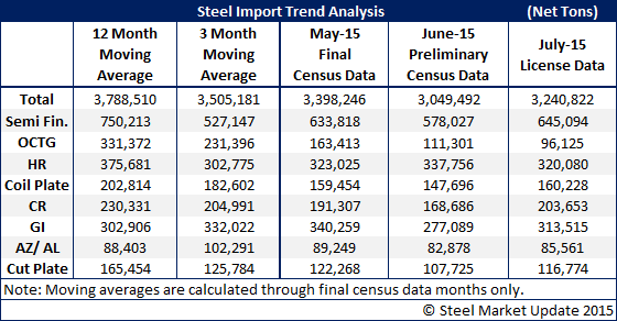The U.S. Department of Commerce updated license data for foreign steel imports for the month of July. Based on the just released data it appears July imports will be approximately 200,000 net tons higher than what was received during the month of June. However, when looking at imports from a 3 month moving average and 12 month moving average, July’s tonnage will be below both.