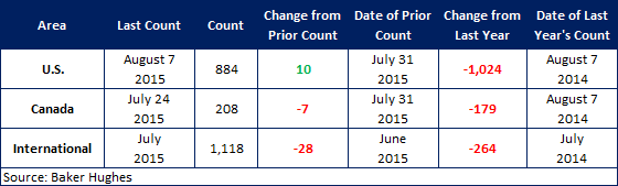 According to Baker Hughes data from August 7, 2015, the U.S rig count for the week was 884 rigs exploring for or developing oil or natural gas. This is an increase of 10 rigs when compared to last week, with oil rigs up 6 to 670 rigs, gas rigs up 4 to 213 rigs, and miscellaneous rigs unchanged at 1 rig. Compared to this time last year, the 884 count is down 1,024 rigs, with oil rigs down 918, gas rigs down 103, and miscellaneous rigs down 3.