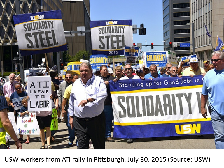 On Thursday, July 30, ATI union workers took their grievances to the doorstep of ATI in Pittsburgh. The rally attracted hundreds of members including supporters from ArcelorMittal and US Steel.