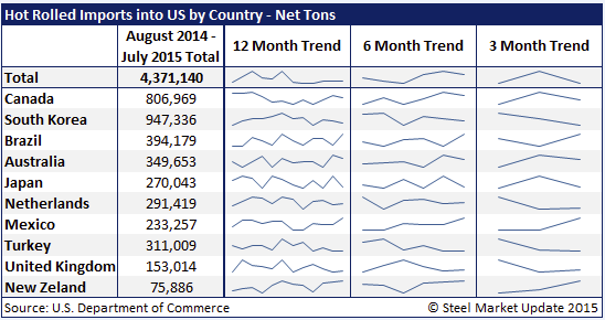 Who are the biggest exporters of hot rolled to the United States over the past twelve months? Canada, South Korea (who supplies USS/Posco HR coil on the West Coast), Australia (who supplies Steelscape on the West Coast), Turkey (although they have cut back in recent months), Brazil (which has been growing their tonnage – a year ago they were a very small supplier and that probably went to CSN in Terre Haute), Japan (last few months has been inconsistent), Mexico (had a little higher than normal spurt in July), Netherlands (pulled back a bit in June and July). I would not expect Canada to be hit and Mexico is a question mark. The mills did not hit Mexico with cold rolled but they did hit Turkey and Brazil which may be a sign that those two countries may be in the cross hairs of the domestic steel mills.