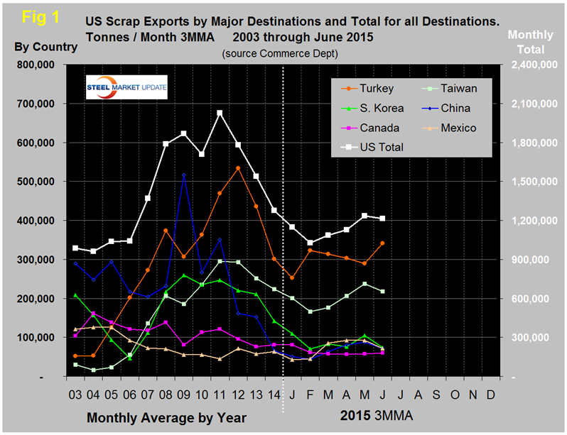 In the first six months of this year bulk scrap exports were 6,893,000 metric tonnes for an annual rate of 13,786,000 tonnes, down by 9.1 percent from the first six months of last year. The tonnages shown in Figure 1 are based on three month moving averages for 2015 and on the twelve month monthly average for previous years. The graph shows that exports declined for three consecutive years, 2012 through 2014 and continued through January and February this year. March saw a trend reversal that continued through May with a small decline in June. In the twelve months of 2014, scrap exports totaled 15,308,000 tonnes, down by 17.1 percent from the same period in 2013.