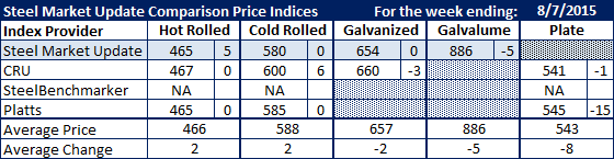 Cold rolled was one product where we saw a split between SMU ($580), Platts ($585) and CRU ($600). Our average for CR was up $3 per ton to $588 per ton.