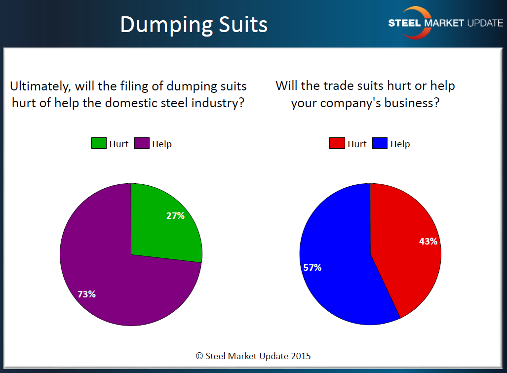 We asked two questions, “Ultimately, will the filing of dumping suits hurt or help the steel industry?” and “ Will the trade suits hurt or help your company’s business?”