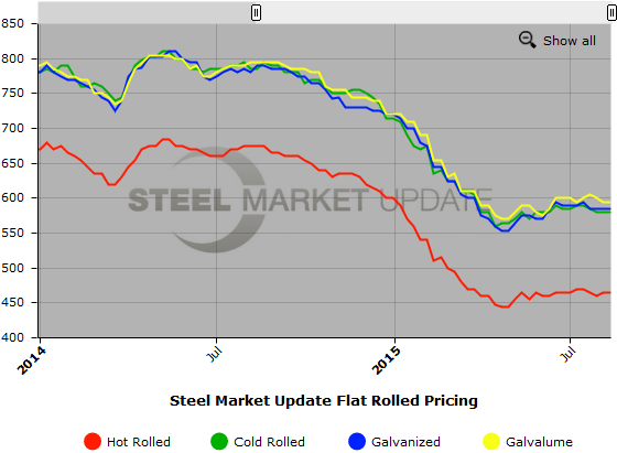 SMU Note: Below is a graphic showing our hot rolled, cold rolled, galvanized, and Galvalume price history. To use the graphs interactive capabilities, you must view it on our website here. If you need help navigating the website or need to know your login information, contact us at info@SteelMarketUpdate.com or by calling 800-432-3475.