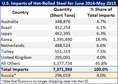 According to the documents filed by the steel mills, the seven countries represented 64.2 percent of the total hot rolled imports between June 2014 and May 2015. Steel Market Update re-created a table that was part of the petition presented to the US DOC by the steel mills. We added an extra line item which is Russia since the Suspension Agreement was repealed last year preventing Russian hot rolled from coming into the U.S. market.