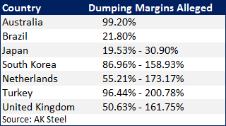 Part of the AK Steel press release on the filing said, “AK Steel and other domestic steel manufacturers have been significantly impacted by the onslaught of what we believe are unfairly traded imports of hot-rolled steel,” said James L. Wainscott, Chairman, President and CEO of AK Steel. “Imports have been flooding our shores, substantially reducing selling prices, shipment volumes, and earnings.”