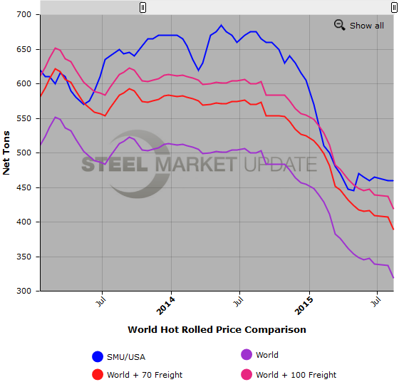 The latest Steel Market Update hot rolled price average is $460 per ton for domestic steel; this is unchanged compared to the late-July figure. The theoretical spread between the world HR export price and the SMU HR price is $41 to $71 per ton ($141 prior to import costs), up $18 from our previous analysis.