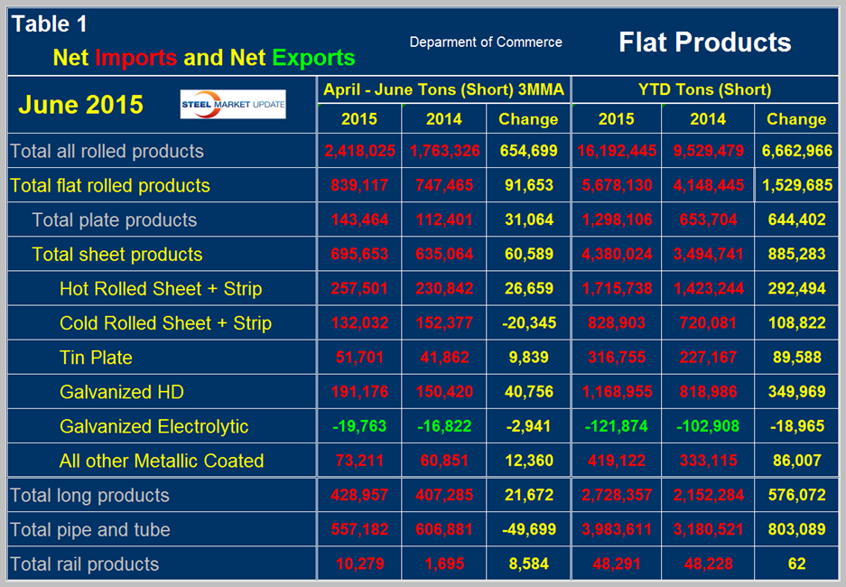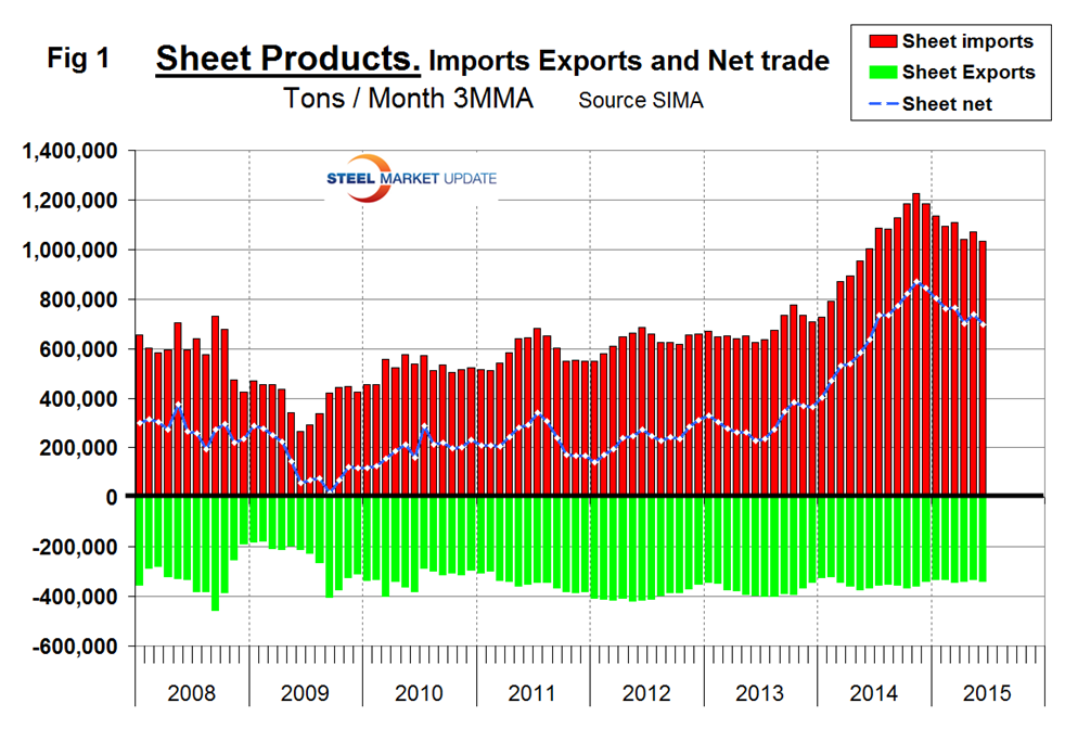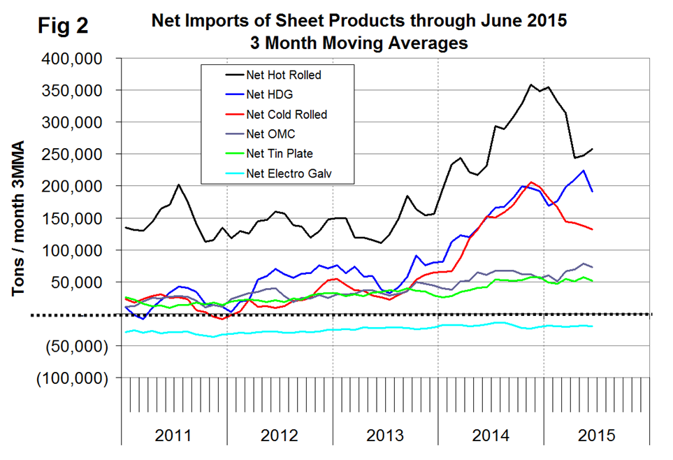 Net imports equals imports minus exports. We regard this as an important look at the overall trade picture and its effect on demand at the mill level. Figure 1 shows that net sheet product imports on a three month moving average (3MMA) basis in June continue to be more than double that which existed before the recession.