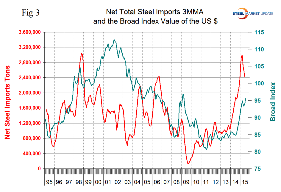 We believe there are two main drivers of the strength of net steel imports. The trade weighted value of the US $ is increasing which makes our exports less attractive to foreign buyers and makes the US domestic market more attractive to foreign sellers as imports are more attractive to domestic buyers. Figure 3 shows the relationship between net imports and the value of the $ since January 2011.