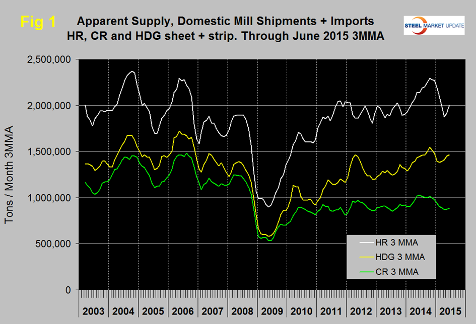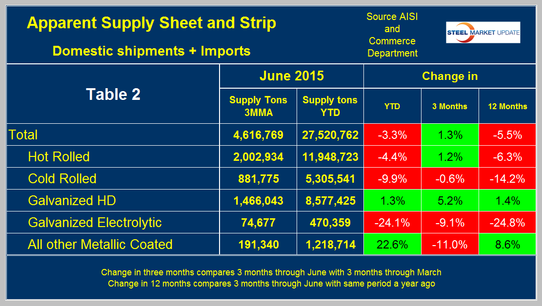 Apparent Supply is a proxy for market demand and is defined as domestic mill shipments to domestic locations plus imports. In the three months through June 2015 average monthly supply of sheet and strip was 4,616,769 tons, up by 1.3 percent from the previous three month period (January through March, 3M/3M). It was down by 5.5 percent from the same period last year and down by 3.3 percent YTD compared to the first six months of 2014. Table 2 shows the change in supply by product on the same basis through June.