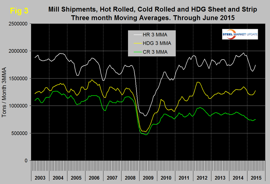 There is a big difference between products. Hot rolled followed the overall trend but cold rolled and coated products did not. Cold rolled declined in the 3M/3M comparison. HDG strengthened in all three time comparisons. Electro-galvanized was down by 24.1 percent YTD and in 3 months was down by 9.1 percent. The first half of 2014 was strong for EG then faded significantly. Results for other metallic coated were excellent YTD being up by 22.6 percent but that performance faded in Q2 with an 11 percent decline compared to Q1. The result for OMC was distorted by an unexplained huge volume of mill shipments in January 2015 plus imports that were above the current norm.