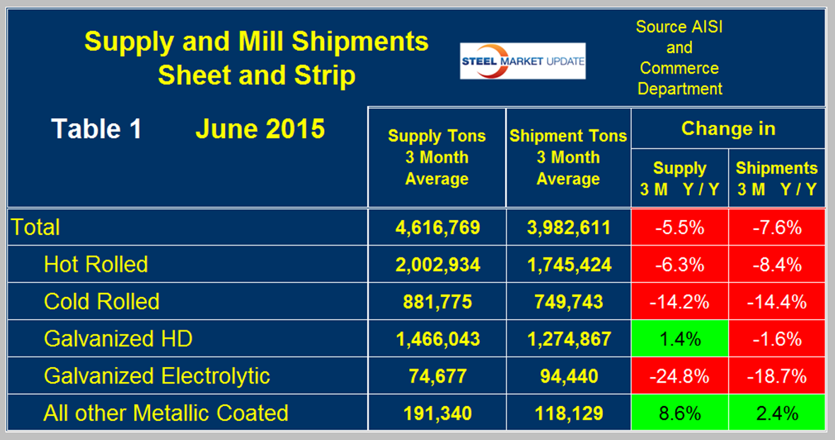 This report compares domestic mill shipments and total supply to the market. It quantifies market direction by product and enables a side by side comparison showing the degree to which imports have absorbed demand. Sources are the American Iron and Steel Institute and the Department of Commerce with analysis by SMU. Table 1 shows both supply and mill shipments of sheet products (shipments includes exports) side by side as a three month average for the periods April through June for both 2014 and 2015.