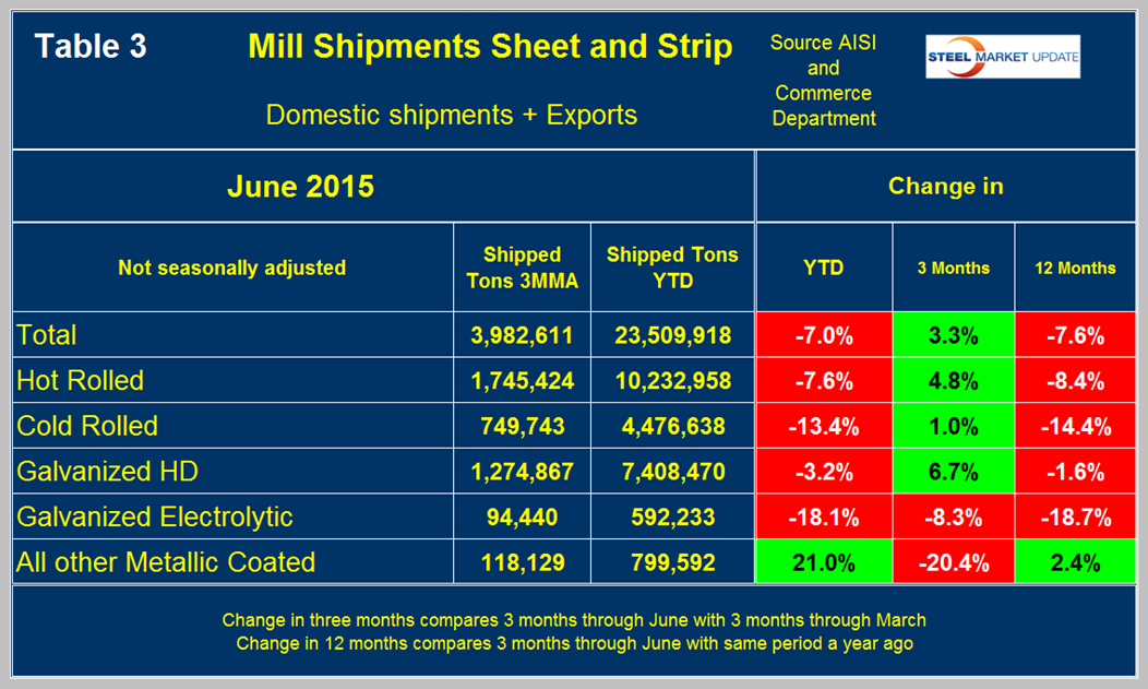 Mill Shipments: Table 3 shows that total shipments of sheet and strip products including hot rolled, cold rolled and all coated products were down by 7.0 percent YTD year over year and up by 3.3 percent in 3 months through June compared to 3 months through March.
