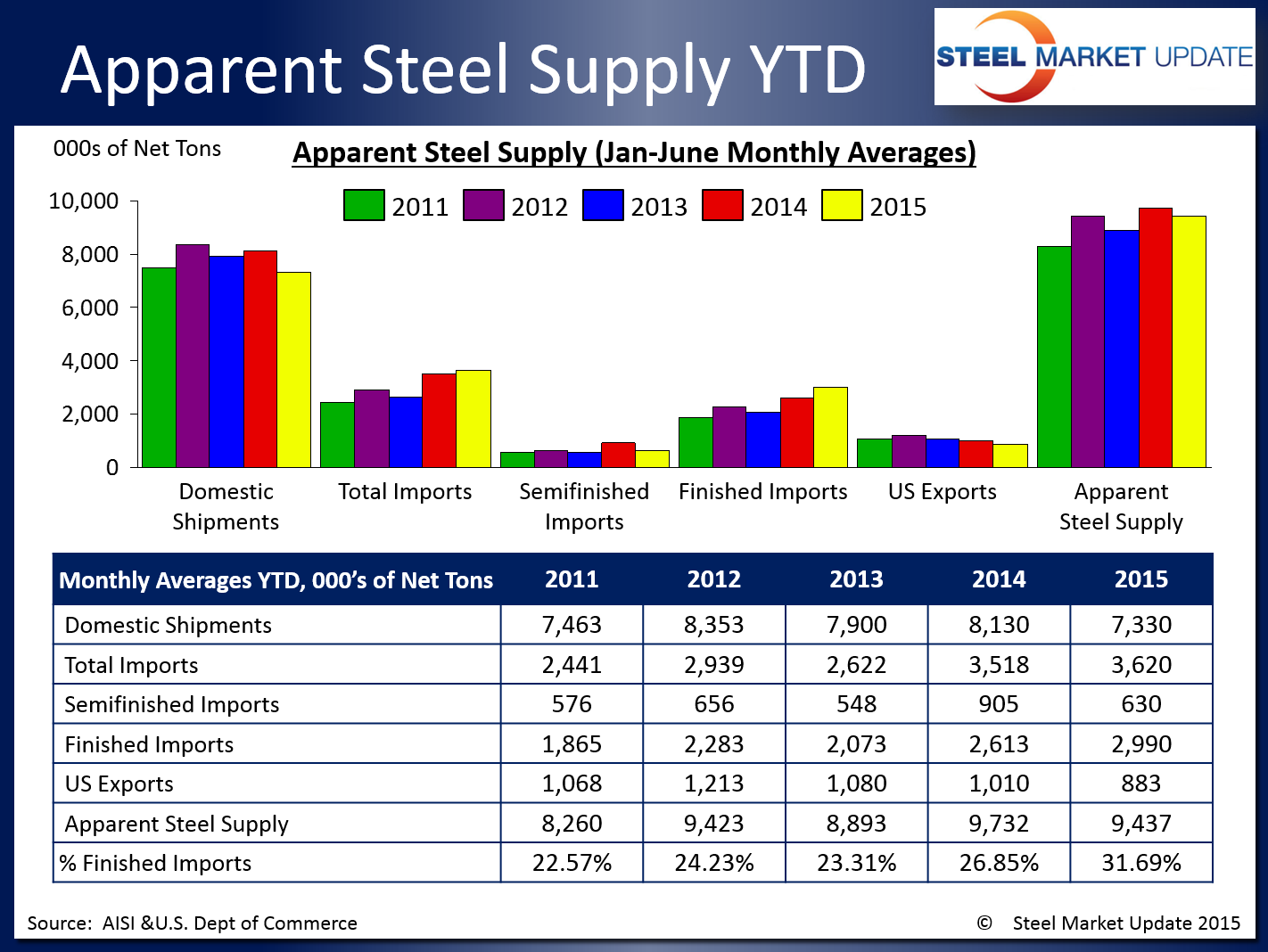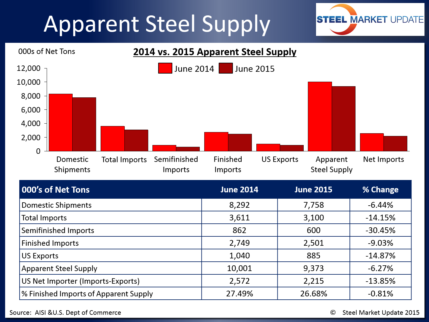 According to the latest data released from the US Department of Commerce and the American Iron and Steel Institute, apparent steel supply for the month of June 2015 was 9,373,498 net tons. Apparent steel supply is calculated by adding domestic steel shipments and finished US steel imports and subtracting total US steel exports.