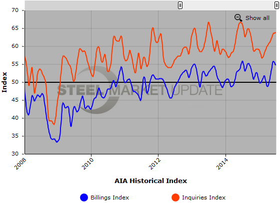 Below is a graph showing the history of the Architecture Billings Index. You will need to view the graph on our website to use it’s interactive features, you can do so by clicking here. If you need assistance with either logging in or navigating the website, please contact our office at 800-432-3475 or info@SteelMarketUpdate.com.