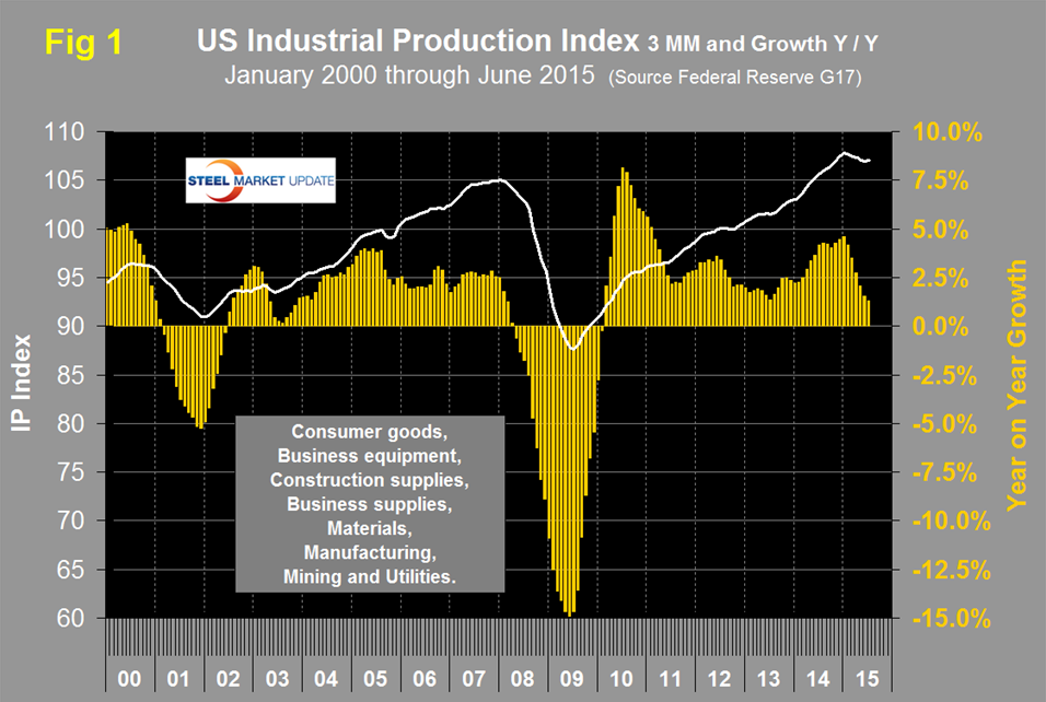 The US sometimes revises data back 60 years or more. The IP index was consistently revised upward since 1994 and was reported as 107.477 for June, up by 0.56 percent from May. The index had an all-time high of 107.9108 in November last year then declined for five straight months through April. The three month moving average (3MMA) in June was 107.05, up by 0.14 from May. The y/y growth of the 3MMA has declined for the last five months through June when it reached 1.3 percent (Figure 1).