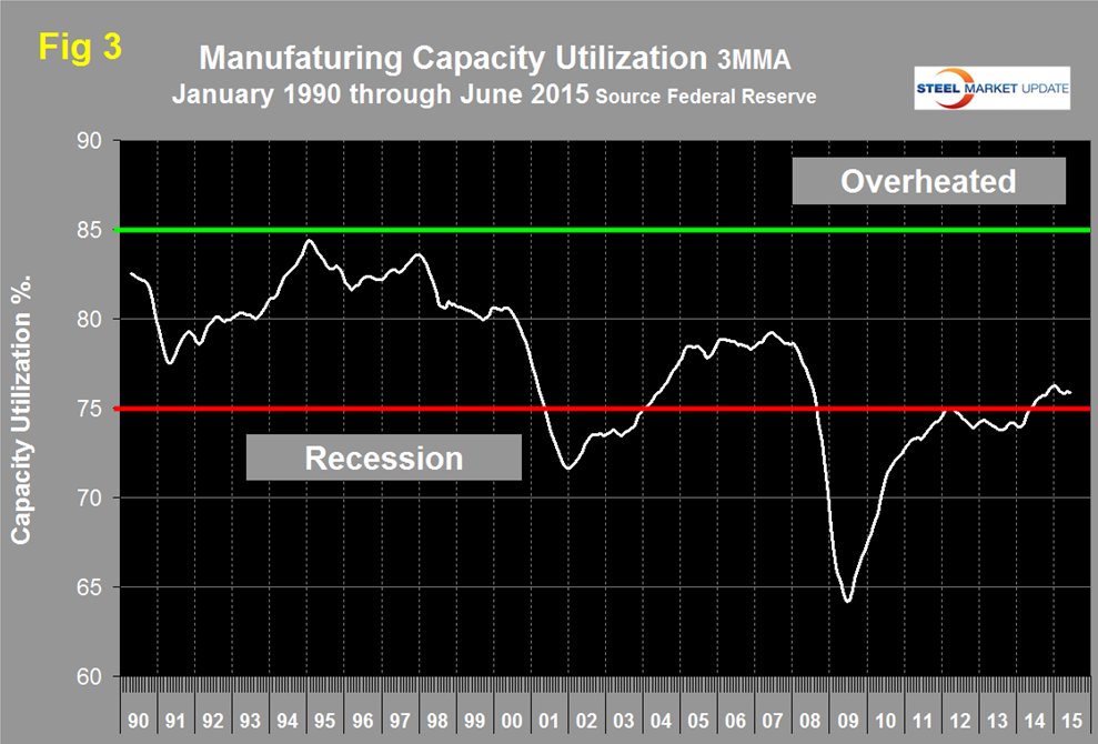 Manufacturing capacity utilization was also revised back through 1994 and in this case was systematically revised down. For example the previous May value was 76.97 percent, this was revised down to 75.66 in the new data. June came in at 76.21 with a 3MMA of 75.95 an increase on 0.07 from May but down by 0.32 since January (Figure 3).