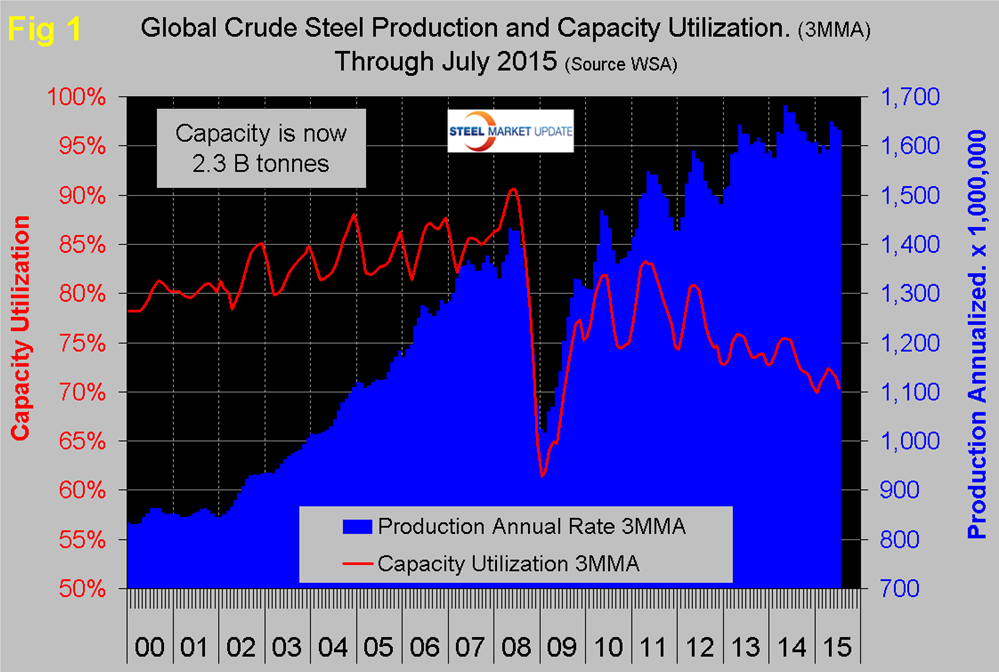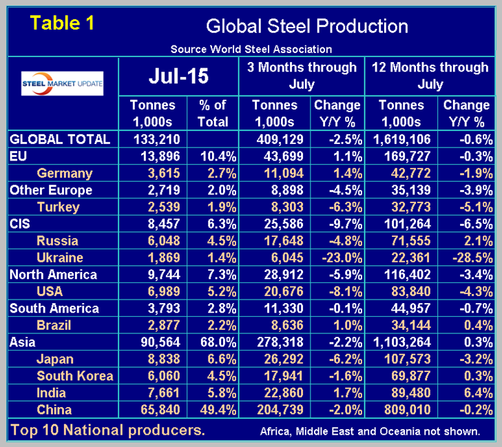 Global steel production in 12 months through July totaled 1.619 billion tonnes with a capacity of 2.3 billion tonnes. Capacity utilization in July was 68.4 percent with a three month moving average (3MMA) of 70.4 percent, down from 71.6 percent in three months through June. China accounted for 49.4 percent of global production in July. Asia as a whole, including India, accounted for 68.0 percent. Production in July on a tons/day basis was 4.297 million tonnes, down from 4.393 in June.