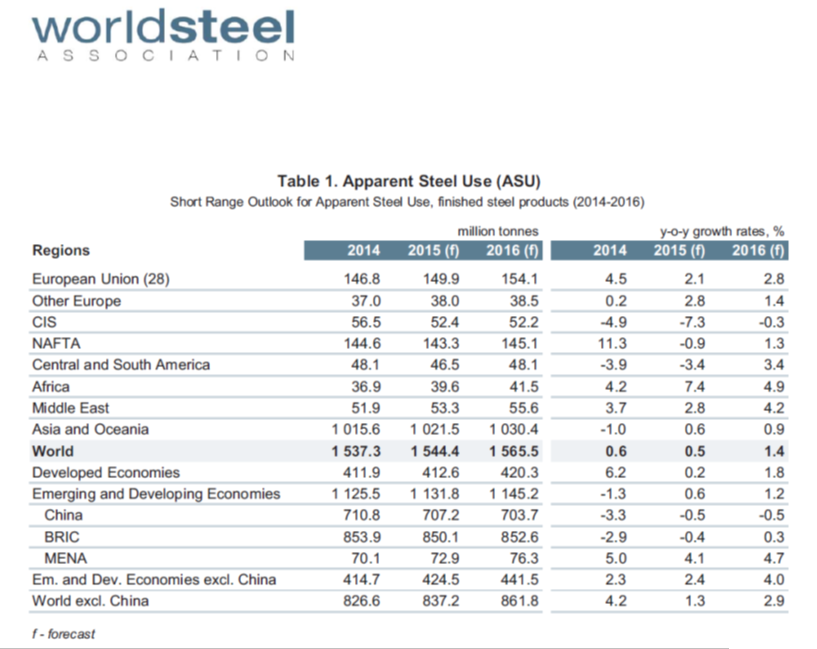 We are again publishing the latest World Steel Association Short Range Outlook forecast for apparent steel consumption in 2015 and 2016 that was released in April. We will leave it in these reports until the next revision is released. The forecast for 2015 continues to looks optimistic and that is increasingly the case (Table 2). Note this forecast is steel consumption, not crude steel production which is the main thrust of what you are reading now.