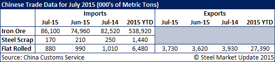 Chinese Iron Ore, Scrap & Flat Rolled Imports/Exports for July 2015