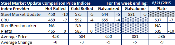 With the exception of Platts, all of the other indexes reporting (and followed by SMU) saw flat rolled products as losing ground this past week.
