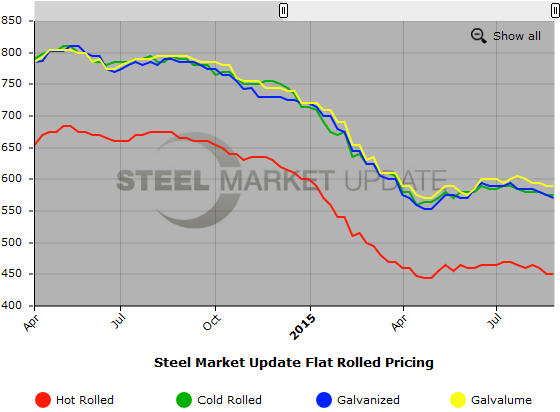 SMU Note: Below is a graphic showing our hot rolled, cold rolled, galvanized, and Galvalume price history. To use the graphs interactive capabilities, you must view it on our website here. If you need help navigating the website or need to know your login information, contact us at info@SteelMarketUpdate.com or by calling 800-432-3475.