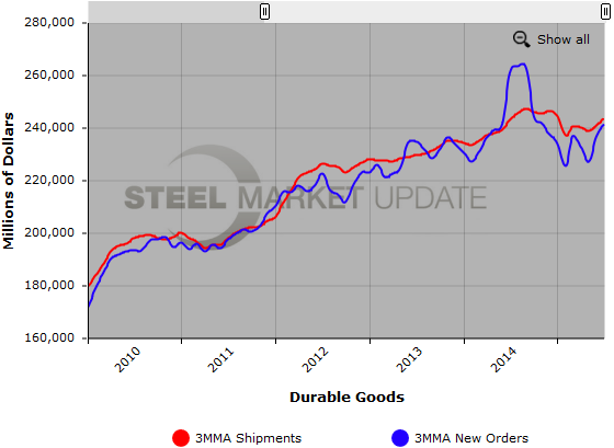 Below is a graph showing the history of durable goods shipments and new orders 3MMA. You will need to view the graph on our website to use it’s interactive features, you can do so by clicking here. If you need assistance with either logging in or navigating the website, please contact our office at 800-432-3475 or info@SteelMarketUpdate.com.