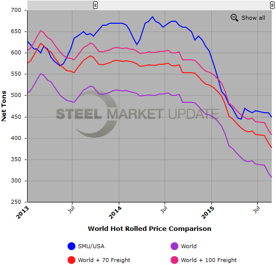 The latest Steel Market Update hot rolled price average is $450 per ton for domestic steel; this is down $10 per ton compared to both the mid-August and late-July figure. The theoretical spread between the world HR export price and the SMU HR price is $42 to $72 per ton ($142 prior to import costs), up $1 from our previous analysis and up $19 from late-July.