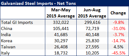 The results of our quick analysis (August number is based on license data thru the 25th of August so the numbers will change modestly when final census numbers are released) we are not seeing any of the countries pushing significantly more galvanized tonnage than what they averaged the three months before the filing.