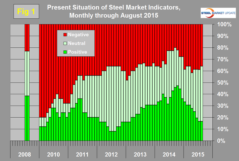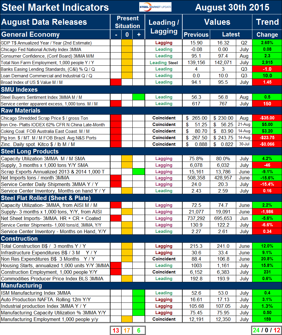 All five of the steel raw materials prices that we track here declined in July but in the August data, the Platts IODEX iron ore price delivered N. China and coking coal FOB Australia’s E. Coast both enjoyed small price increases. Last month we stated that, “We expect scrap prices to take another hit when the data is released by AMM in the next couple of weeks,” and this occurred with a $35 decrease in Chicago shredded. Based on our benchmark indicators we think scrap is still high. There were no trend reversals for the long product market indicators. Flat rolled had an increase of one in the positive category as net sheet imports declined, albeit from a very high level. The long products numbers are based on data from the SMA who get their data out faster than the AISI. There was no change in construction or manufacturing trends, all indicators were moving in the right direction.