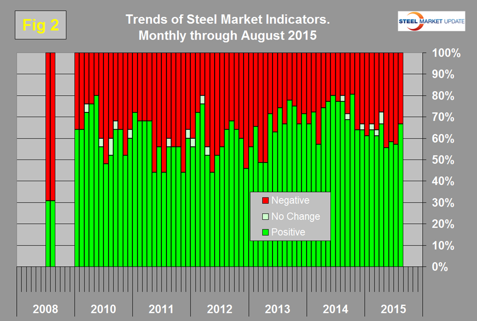 In the general economy there were two trend reversals. Consumer Confidence changed from a negative trend to positive. As we have explained elsewhere this measure has been very volatile this year. Demand for commercial and industrial loans as reported by the Federal Reserve senior loan officer survey reversed direction and became positive in the 3rd quarter. The trade weighted value of the US dollar which had been declining in May took off again in June and July which we regard as a negative for net steel imports. The trends of the two Steel Market Update proprietary indicators which had both been positive in June and July saw a reversal in the service center excess value this month. Steel buyer sentiment improved to 56.83 on August 20th and as shown in Figure 3 is still at a historical high level.