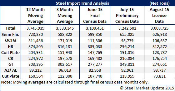 Earlier today the U. S. Department of Commerce released the latest license data through the 1st of September. Based on license data August total steel imports will be 3.0 million net tons. If confirmed when the Final Census data is released August will be the lowest tonnage so far this year.