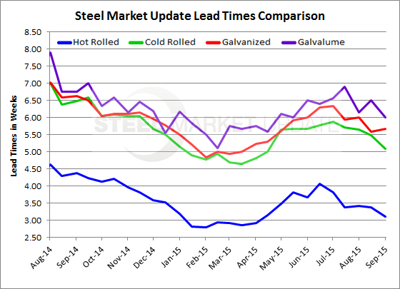 Hot rolled lead times averaged 3.11 weeks which is down modestly from the 3.41 weeks reported at the beginning of August. When we took a look at the beginning of July, HRC lead times were at 3.82 weeks and one year ago they were reported to be 4.37 weeks.