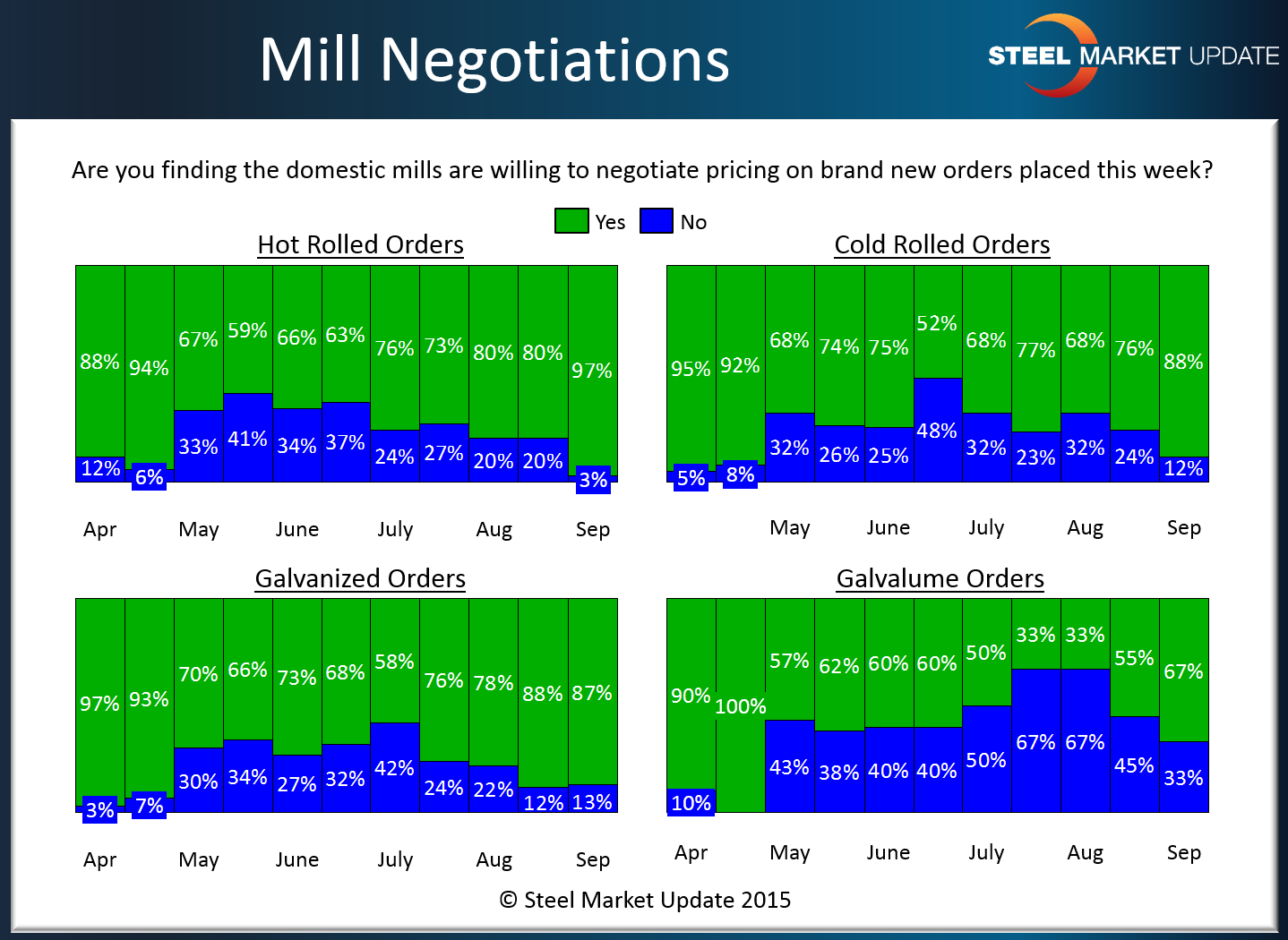 Ninety-seven percent of our respondents reported the domestic mills as willing to negotiate hot rolled prices. This is 17 percentage points higher than our last survey during the middle of August. We did see hot rolled prices slip again this week as at least one EAF mill has gotten aggressive for orders of 1,000 tons or greater.