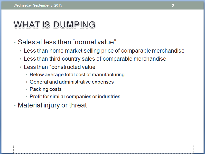 As we moved about the conference hall and spoke to traders, steel mills, distributors and end users, the consensus of opinion was that China would be hit with duties and probably hit hard. However, the room was split as to whether all of the other countries named in the suits were really dumping (explanation of dumping from trade attorney Lewis Leibowitz presentation shown below).
