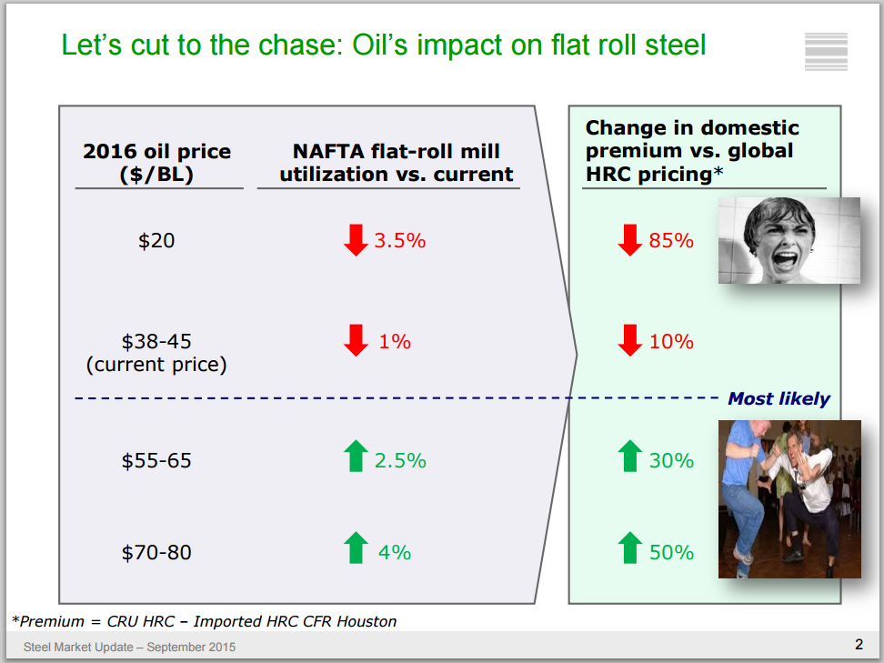 The one area that continues to be a concern is the energy market – especially oil rigs. Sachin Shivaram of Tenaris share a particularly useful point of view about what oil prices will mean to the flat rolled steel market. Sachin told the group if oil stays at its current price level of $38-$45 per barrel it would have a negative one percent impact on the domestic mill utilization rates from current levels. On the other hand, if oil prices were to rise to $55-$65 per barrel as many analysts are predicting for late 2016, it would result in a 2.5 percent improvement in utilization rates and would also have an impact on pricing.