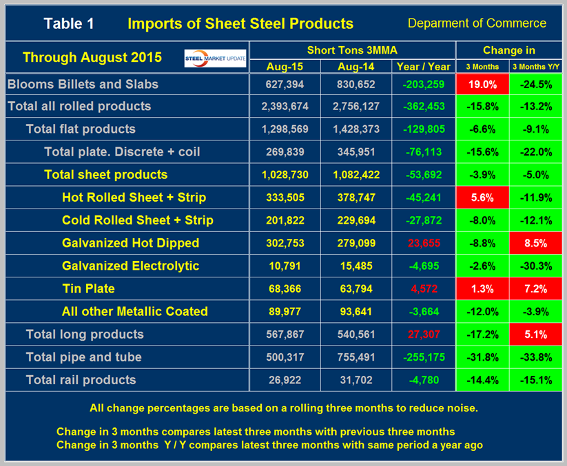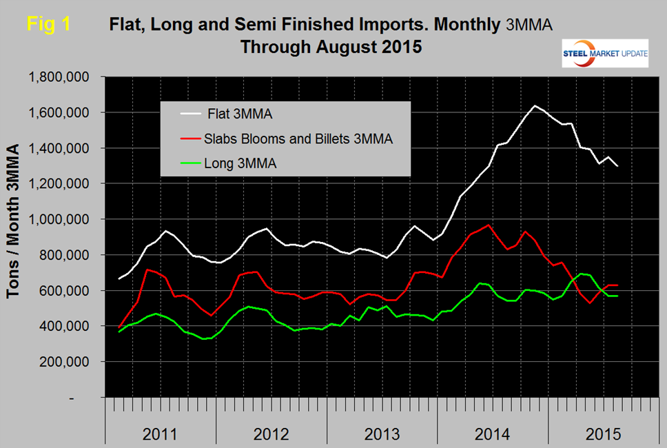 The early look, the latest of which you are reading now has been based on three month moving averages (3MMA) using August licensed data and June and July final data. We recognize that the license data is subject to revisions but believe that by combining it with earlier months in this way gives a reasonably accurate assessment of volume trends by product as early as possible. The main issue with the license data is that the month in which the tonnage arrives is often not the same month in which the license was recorded. In 2014 as a whole our data showed that the reported licensed tonnage of all carbon and low alloy products was 2.3 percent less than actually receipts, close enough we believe to confidently include licensed data in this current update. Total rolled product licensed imports in the single month of August were 2,282,930 short tons with a 3MMA of 2,393,674 tons. August licenses were down by 9.3 percent from the final July volume. On this basis flat rolled was down by 12.2 percent, long products down by 1.2 percent and pipe and tube down by 3.6 percent. At SMU we prefer not to dwell on single months results because of the extreme monthly variability that can occur in individual products. In the comments below we use three month moving averages to get a more representative picture.