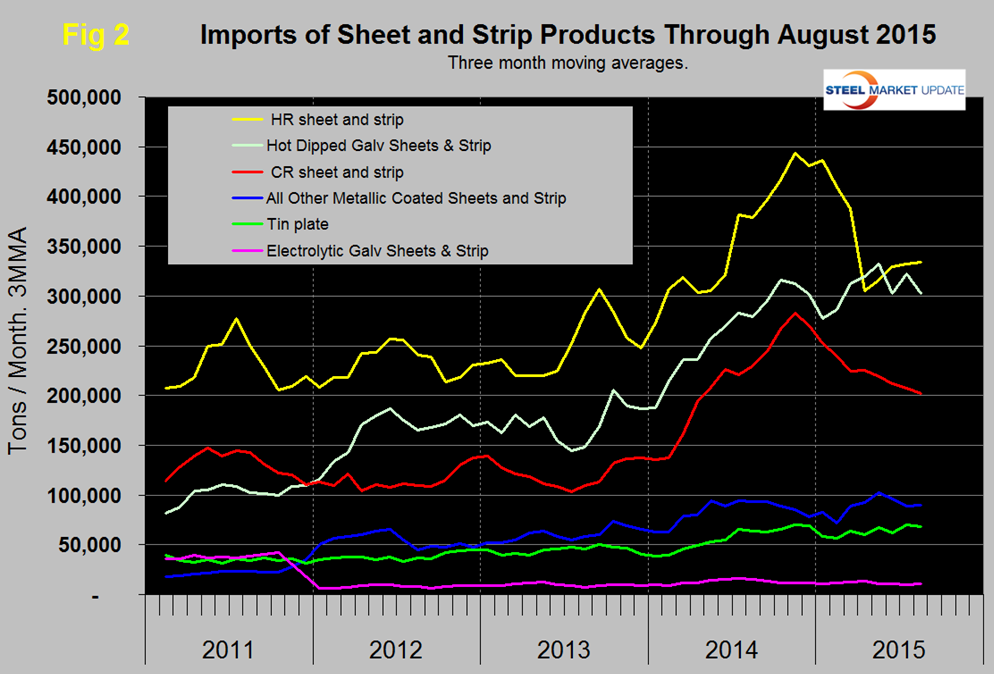 Of the big three tonnage items, HR, CR and HDG, hot rolled which was down by 21.2 percent in April steadily increased in May through August. Cold rolled peaked at 283,000 tons in November and has since decreased to 201,822 tons in August. Hot dipped galvanized imports increased in February through May and have been erratic in the last three months with not much direction. All other metallic coated (mainly Galvalume) peaked in May at 102,000 tons and through August had declined by 12.04 percent. Tin plate had been trending up for all of 2014 but has been range bound this year. Electro-galvanized keeps on rolling along with little change in three years.