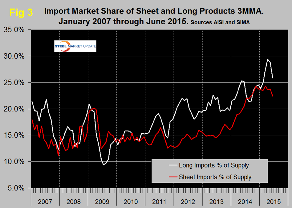 For long products the import share skyrocketed in January through April then declined sharply in May and June. The import market share for sheet products peaked at 24.3 percent in March and fell to 22.4 percent in June.