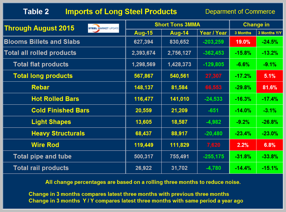 For total long products the tonnage was down by 17.2 percent 3M/3M but up by 5.1 percent Y/Y. In the 3M/3M comparison, the only product having an import increase was wire rod. Imports of pipe and tube declined by 31.8 percent 3M/3M and rail products were down by 14.4 percent.