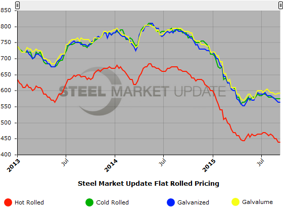 SMU Note: Below is a graphic showing our hot rolled, cold rolled, galvanized, and Galvalume price history. To use the graphs interactive capabilities, you must view it on our website here. If you need help navigating the website or need to know your login information, contact us at info@SteelMarketUpdate.com or by calling 800-432-3475.