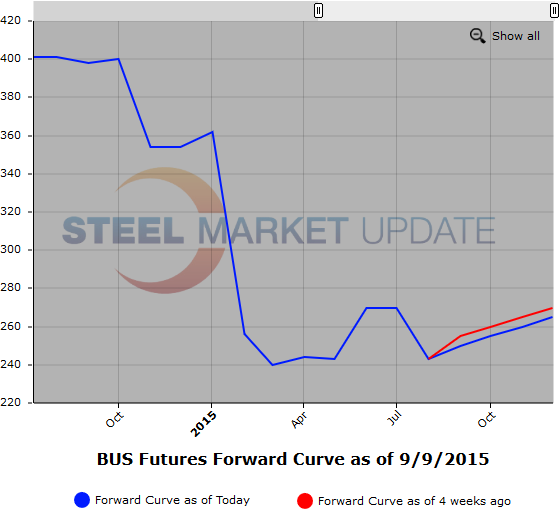 Below are two graphics of the HRC and BUS Futures Forward Curve. The interactive capabilities of the graphs can only be used in Steel Market Update website here. If you have any issues logging in or navigating the website please contact us at info@steelmarketupdate.com or (800) 432 3475.