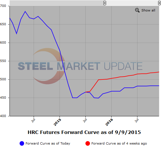 Our last piece about the increasingly unlikely scenario of a near-term return to $500/ton HRC here in the US was one of those articles that made us wonder if we were being too pessimistic. It is at those times that we must remind both ourselves and our readers that it is not FCStone LLC or its brokers and analysts’ personal opinion that HRC prices are showing increasingly limited upside. That is the current statement of the forward curve in the market itself, and …yes, it’s still getting weaker: