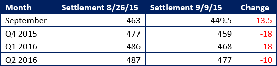Another market that has seen some decent upside in the last two weeks? Surprisingly enough that would be iron ore, which has moved from a spot month settlement of $55.71/tonne on August 26th to $56.59/tonne on September 9th. It’s not much, but it’s the best news there is to report on this particular beat in the last few weeks.