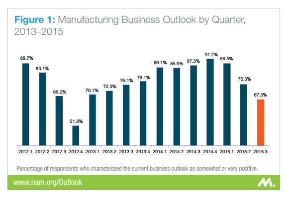 Nearly 80 percent of manufacturers in the third quarter National Association of Manufacturers Outlook Survey cite an “unfavorable business climate” as the top business challenge. The Survey Outlook Index dropped to 45.6 from 51.8 in June with small, medium and large manufacturers all expressing declining optimism.